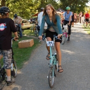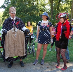 Ještě než jsem s kolegyní Jitkou Vrtalovou, která zde byla stejně jako já v roli cyklonovinářky, stihla dojíst oběd, přijel první závodník do cíle. Obě jsme ho prošvihly. Druhý dojel náš kolega z pracovního týmu národního cyklokoordinátora Tomáš Cach. Za ním, už závodníci přijížděli jeden za druhým. Dženlmenům na kolech vlála saka, elegantní dáma v puntíkovaných šatech po dojezdu do cílové rovinky nasadila klobouk, který jí galantně přivezl Sherlock Holmes.