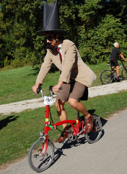 Angličané jsou pověstní svými společenskými pravidly a specifickým humorem s lehkým nadhledem. Stejně jako je pro dámy téměř nemyslitelné jít na vyhlášené dostihy bez klobouku, je nemožné podcenit výběr vhodného závodního oděvu na mistrovství Bromptnů. Stylový závodní oděv dotváří koloryt této společenské akce. Pánové v saku s kravatou a v krátkých kalhotech, dámy v šatech a sukénkách. Originální kostýmy upravené pro jízdu na kole nakonec hodnotí diváci. Stužkou každý obdaruje závodníka v oděvu, který se mu nejvíce líbí. Ve finále soutěže Elegán se organizátoři ptali: „Proč jste volili tento oděv?" Odpovědi některých byly vskutku anglické: Soutěžící v černých šatech s nápadně červenými doplňky odpověděla s potutelným úsměvem na tváři: „Protože jsem z Ďáblic." Mladík v kostkované perelíně, vestičce s nezaměnitelnou kšiltovkou a dýmkou v ústech zase: „Já jsem dostal případ." Dívka v kompletu skládané sukně a saka odpověděla: „Protože jsem čekala anglické počasí." Elegantní dáma v puntíkatých šatech s půvabným kloboukem a šálou na krku: „To je můj běžný denní oděv." Nejvíce stužek nakonec sesbíral Sherlock Holmes. Zvítězil a získal tak originální cyklistické Brompton sako se spoustou vychytávek. Nejen že je toto sako z funkčního dešti odolného materiálu (v Británii nepostradatelná věc), ale pokud ohrnete límec a manžety na rukávech, „vystrčíte" na řidiče reflexní plochy. Další reflexní plochu můžete vytáhnout po rozepnutí zipu na zádech saka. Čtverec tenké žluté reflexní látky s odrazivými symboly skládacího kola Brompton je účinným bezpečnostním prvkem pro jízdu na kole v noci či za šera.