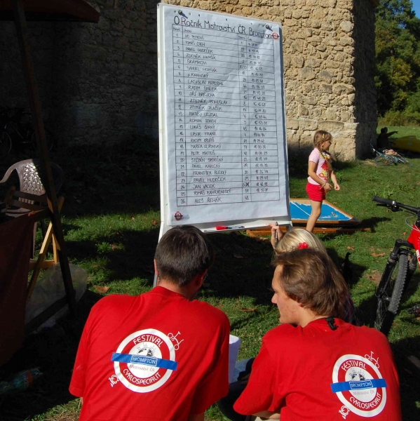 Pro diváky, účastníky i cyklisty či turisty, kteří mistrovství ČR kol Brompton navštívili, byla připravena také jedna zajímavá soutěž názorně demonstrující, jak malý tenhle Bromík ve složeném tvaru je. Každý si mohl tipnout a svůj tip vložit do koše v autě. Pak na cestu před hradem, kde stálo auto, snesli majitelé své složené miláčky všemožných barev a vytvořili pestrobarevnou řadu. Pořadatelé vyzvedli košík s tipovacími lístky a mohlo se začít s nakládáním. Mezi zadní dveře na sklopená sedadla se jich vešlo pět (já tipovala šest), do další řady čtyři (já tipovala pět). Ve vnitřním prostoru auta mizel opatrně prokládán dekou jeden bromík za druhým. Občas jen tým nakladačů prostřednictvím moderátora zažádal o Bromíka se standartní sedlovkou místo kousku s teleskopickou, který byl na řadě. Já už se pomalu loučila se svým odhadem. Jenže pořadatelé si vyžádali další kola. Bylo už jasné, že původně připravených jednadvacet kousků nebude stačit. Se vzrůstajícím počtem kol, která v oktávii mizela, jsem získávala ztracenou naději. Když byl počet kol, které se do oktávie vešly, uzavřen, nevěřila jsem - můj tip vyšel. Do tohoto kombíka se vešlo opravdu 28 složených kol Brompton. Díky záznamu na kameru a dvojímu přepočítání složených kol po vyložení se tak tento počet dostane do Guinessovy knihy rekordů. Správný tip mělo 5 diváků včetně mne, takže vítěze museli vylosovat. Já to ale nebyla :-(