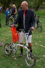 Než se stačili organizátoři vzpamatovat, byli v cíli první šampioni. S časem lehce přes 14 minut, činila jejich průměrná rychlost na osmiapůlkilometrové závodní trati 36,5 km/h. Pokud vás to překvapuje, tak vězte, že průměrná rychlost nejlepších závodníků na Mistrovství světa Bromptnů v Blenheim Palace je dokonce 39km/h. Právě to svědčí o tom, že Brompton není jen tak nějaká skládačka. Chtělo by se říci šikovné české ručičky, ale Bromptna dávají dohromady britské ruce. Do detailů domyšlené technické řešení spolu s precizní ruční prací je základem prosperity této dnes již velké a známé londýnské firmy (vyrábějící cca 45 000 kol ročně), jejíž značka je pojmem ve světě skládacích kol. Jen pár minut po nejrychlejším závodníkovi byla v cíli také první žena. Byla to slečna Zuzana Hudečková ve stylové vestičce s blýskavým obrysem svého skládacího kola. S cílovým časem 17min 30sec byla její průměrná rychlost na trati 30 km/h. To je velice slušný výkon. Závodní trať ale projel i pán se psíkem v předním košíku či mladík, který závodil i se svým cestovním zavazadlem. Některé účastníky vítal špalír diváků v cíli hlasitým jásotem. Ovace sklidil chlapík v kostýmu Červené Karkulky, který si dokonce v košíku na nosiči vezl buchty a víno pro babičku. Hlasitého přivítání se dostalo také korpulentní dámě v kloboučku, která ve svých 72 letech přijela se svým Bromptonem až z Pardubic.