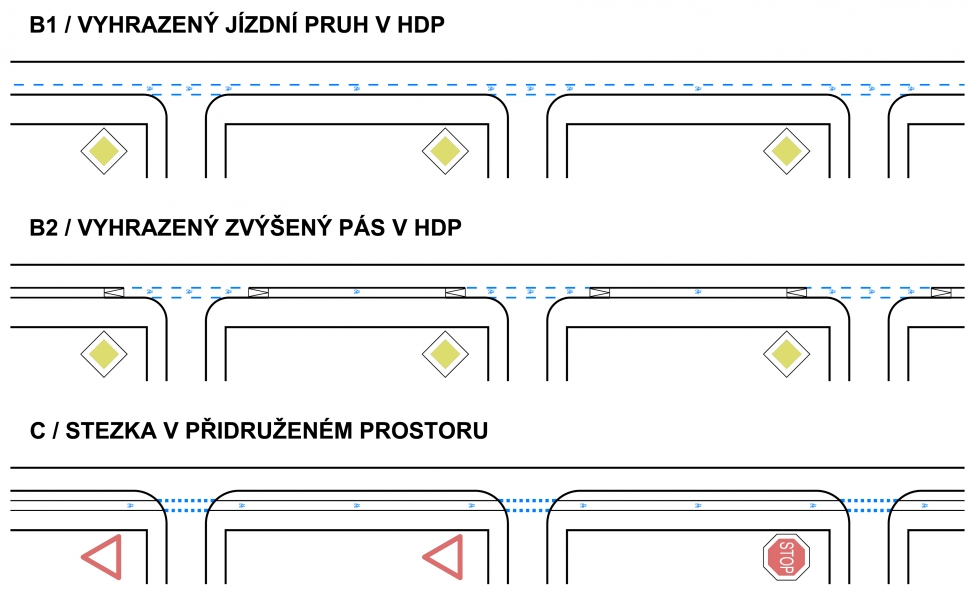 prostor pro cyklisty („předsunutá stop čára") na světelné křižovatce - umožňuje cyklistům využívajícím cyklopruh v HDP, aby při čekání na zelenou stáli před auty v pruhu pro motorová vozidla a nemuseli dýchat zplodiny z výfuků. Více o tom, jak použít představený prostor pro cyklisty najdete zde.