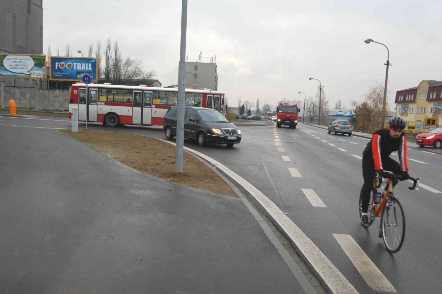 Honza: „Přestože byl docela provoz, oba jsme nakonec předjížděli auta, která davala přednost na kruhovém objezdu. I když to nevypadá, jízda po cyklostezce je mnohem náročnější - po každém brždění při přejíždění komunikace totiž člověk ztratí energii, takže se vlastně skoro pořád zastavuje a rozjíždí. Většina obrubníků totiž nejde v běžné rychlosti, pokud nejede žádné auto, které mu bych musel dát přednost, přejet. Škoda, že ti, co stezky staví, po nich taky nejezdí - jinak by ty obrubníky při nájezdech na stezku nemohli takto dělat.”
