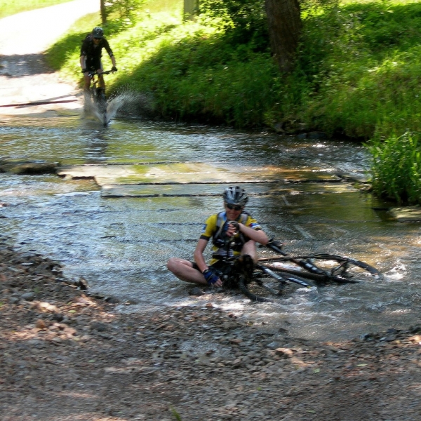 V dalších dnech nás pak čekaly zříceniny hradů Žebrák a Točník, údolí Berounky s Týřovem, Vraní skála, zámek Zbiroh a další zajímavosti. „Zážitková trasa" byla trasa údolím Zbirožského potoka, kde se střídaly zpevněné cesty s terénními úseky, brody a lávkami, takže zejména kluci se vyřádili. V jednom z brodů s kluzkými panely se několik (ne)dobrovolníků pěkně vyválelo, k velkému pobavení přihlížejících. Se smíšenými pocity bude na tuto událost asi vzpomínat Kuba, kterému opodál odešla přehazovačka, a to tak, že neopravitelně. Na část zpáteční cesty si operativně stopl traktor. On se ještě vešel do kabiny, ale kolo se muselo vézt ve lžíci! Stejný problém měl i Lukáš z Karlových Varů, který ale zpátky na základnu dojel a náhradní bicykl večer promptně dovezl obětavý rodič.