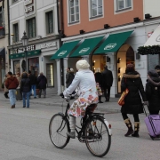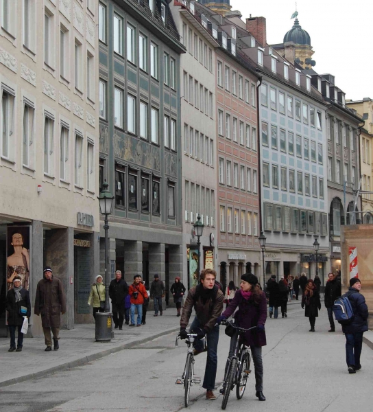 V předvánoční době, kdy jsem Mnichov navštívila, žilo centrum města vánočním trhem. Pěší zónou s trhy jsem tedy procházela s kolem v ruce a někdy jsem musela pěkně kličkovat, abych mezi davy Němců (ale i Čechů) s kolem prošla. Možná díky tomu jsem přišla na Peterské náměstí (Petersplatz) těsně před polednem, kdy se zde houfovali lidé a čekali než spustí orloj na radniční věži. V místě trhů i v přilehlých ulicích jsem stále potkávala zaparkovaná kola. Cyklostezky vedly často pěší zónou se zákazem vjezdu pro motorová vozidla. Na vjezdu na stezku v pěší zóně byla často také dodatková tabulka Schrittempo, což znamená rychlostí chůze. I tady se, podobně jako u nás, pěší „promenádovali” v koridoru stezky jasně vyznačené vodorovným značením. Dle mého soudu to ale většinou byli cizinci. Do některých rozsáhlejších pěších zón byl cyklistům vjezd umožněn, ale jen v určitém směru spojujícím jedno místo na kraji zóny s druhým.