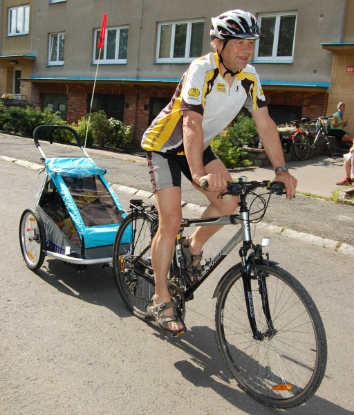 O cyklopřívěsech toho zatím moc nevím a tak jsem se obrátila na pana Bystřického, který s prodejem cyklopřívěsů pro děti v Plzni začínal. Připravil nám jednosedadlový vozík značky Croozer. Z placaté konstrukce nasazením bočních kol z připraveného vaku, který je součástí výbavy, rychle vyrobil vozík za kolo. Ještě připevnit oj a je hotovo - tedy vozík. Vašek uvolnil rychloupínak na zadním kole a vložil do něj hranol pro uchycení oje. Jak nás pan Bystřický upozornil, standartně se dodávají dva kusy hranolu, aby si je mohli připevnit na kolo oba rodiče a v tažení se mohli případně střídat. My se také vystřídali, napřed si prázdný vozík vyzkoušel Vašek, pak v něm povozil Janinku. Poté ji provezla máma a nakonec já. Nutno říci, že vozík se vezl dobře a s vyjímkou mírného nadjíždění do zatáček nebylo třeba nějakých změn v řízení kola. Navíc tahle kolosouprava jela velice lehce, jako kdybych nic netáhla. Janina je sice ještě malá, ale dokážu si představit, že bych v přívěsu vezla i další výbavu na cestu pro sebe i pro ni.
