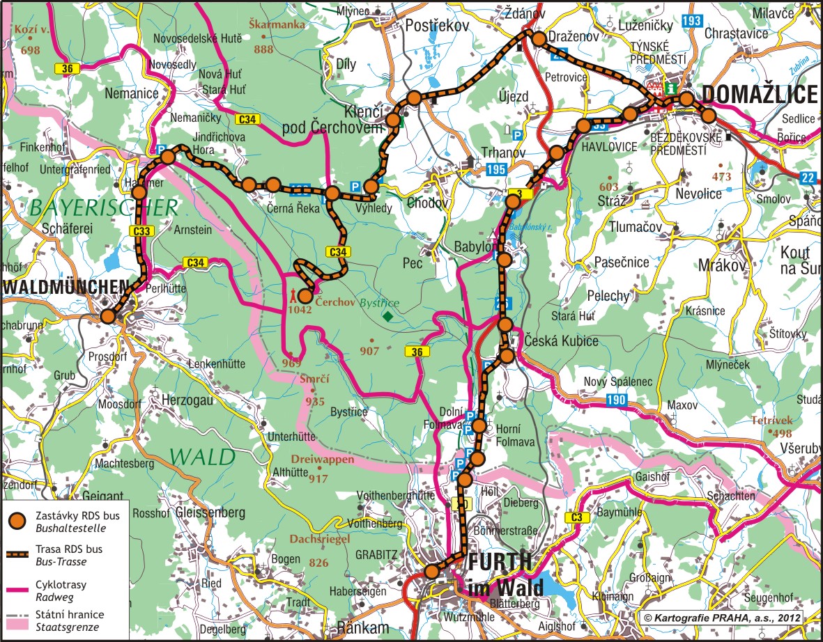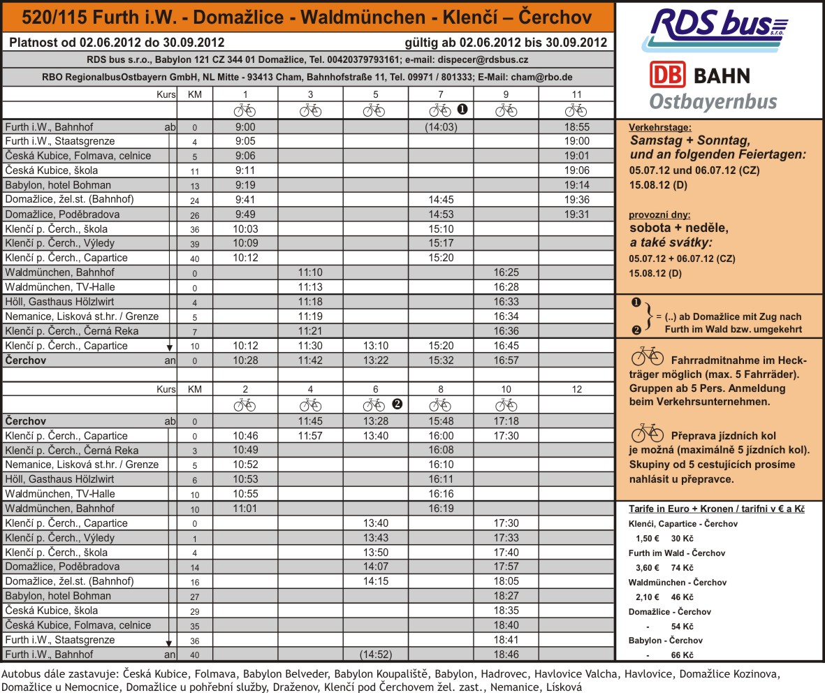 Čerchov společnost RDS bus, s.r.o. Dispečer / rezervace: tel. 379 793 161, 777 330 313, dispečer@rdsbus. Cyklobus ráno časově navazuje na osobní vlak 7408, který vyjíždí o sobotách a nedělích z Plzně v 8.09 h a na nádraží v Domažlicích přijíždí 9.30 h. Odjezd z domažlického autobusového nádraží, které je hned u vchodu do železniční stanice, je pak v 9.41 h. Cyklobus vyjíždí na vrchol Čerchova (v jízdním řádu zastávka Klenčí pod Čerchovem, Capartice) několikrát za den, což zjistíte z jízdního řádu, který najdete spolu se letáčkem a mapkou trasy v příloze tohoto článku. Letáček je v tištěné verzi k dispozici v Informačním centru v Domažlicích a v Plzni