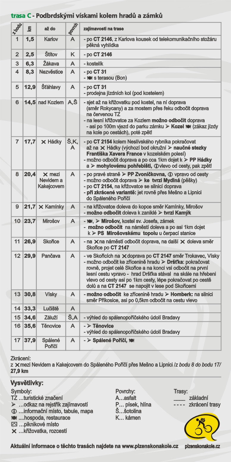 Všechny tři trasy včetně této vyjíždějí ze Spáleného Poříčí a do tohoto půvabného podbrdského městečka se i vracejí. Každá trasa umožňuje zkrácení. Většina trasy vede po asfaltových komunikacích s minimálním provozem, část je vedena po zpevněných lesních cestách, proto je vhodné použít kolo trekingové nebo horské. Pokud využijete tyto tipy na výlety, můžete se podívat k vyhlášeným Padrťským rybníkům, do přírodních parků Brdy, Pod Štědrým, Buková hora - Chýlava, ale i do dalších rozsáhlých lesních porostů střední a jižní části Brd se spoustou kvalitních zpevněných lesních cest a úžasnými výhledy do údolí Úslavy.
