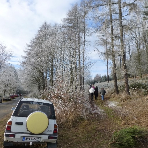 Ze silnice jsme odbočili až v nejvýše položeném místě na žlutou turistickou značku.