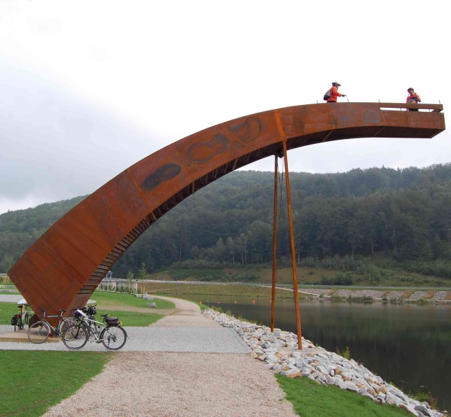 Z městečka jsme vyjeli po úzké cestičce brankou, pak se dali doleva kousek po silnici a opět úzkým průjezdem mezi domy vpravo. Tak jsme se napojili na stezku, která nás mezi poli kolem zahrad vyvedla až na silnici k Drachensee. Nově vybudovaná přehrada Drachensee má i krásně upravené okolí s malým přírodním divadlem a nezvyklou vyhlídkou ve tvaru vzpínajícího se draka. Vystoupali jsme nahoru a pokochali se výhledem. Stálo to za to. Pánové pak obdivovali důmyslné konstrukční řešení schodů.