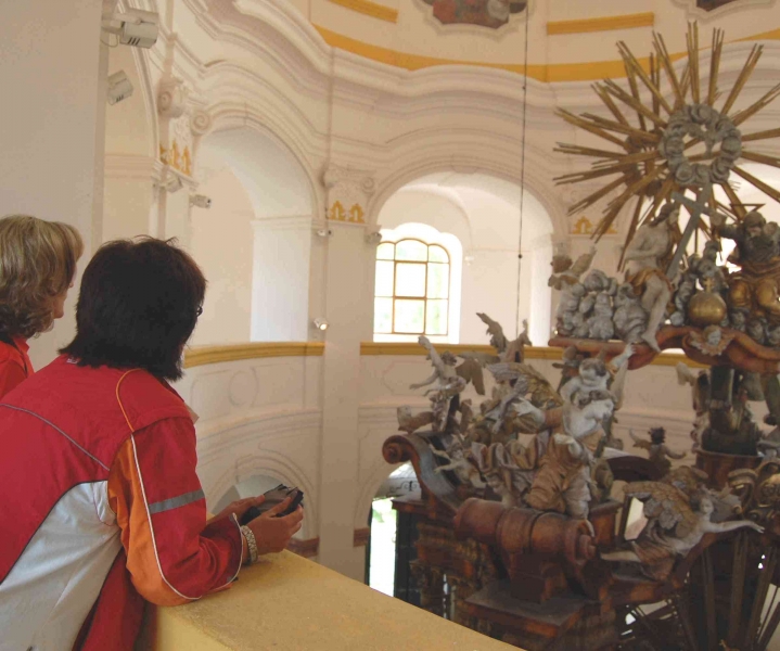 Z Merklína nás ráno čekal zahřívací kopeček kolem Merklínské hůrky. Průjezd Soběkurami jsme úspěšně zvládli (pozor na správné odbočení vlevo) a dojeli do zdáli viditelných Dnešic. Projeli jsem kolem nově opraveného kostela a kolem chlumčanské keramičky poté směřovali do Dobřan. Za modrou budovou pivovaru Modrá hvězda jsme zastavili u infocentra a s průvodkyní se vydali do kostela sv. Víta. Tato unikátní stavba realizovaná podle návrhu známého barokního stavitele Jakuba Augustona mladšího nás doslova uchvátila. Prohlédli jsme si oboustranný oltář z přízemí i ochozu v patře. Opravdu jedinečný zážitek.