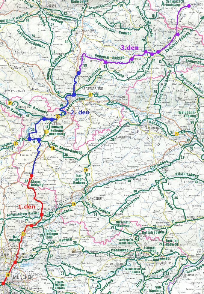Důležitou částí předcestovní přípravy bylo rozvrhnout si trasu na jednotlivé denní etapy. Vzdálenost Mnichov - Furth im Wald činí dle kilometráže v oficiálním průvodci 254km, do Domažlic pak 275km. Pro lepší orientaci uvádím v dalším textu za jmény jednotlivých míst na trase i jejich kilometráž z výchozího bodu v Mnichově dle oficiálního průvodce po trase od nakladatelství Publicpress - např. Furth im Wald (MRPP 254 km). Rozdělení do etap tedy bylo jasné - tři etapy na tři dny s tím, že ta první bude nejkratší. Ubytování kolem padesátého kilometru trasy se nám ale nepodařilo najít (je to blízko letiště), takže náš penzion byl až v Lindkirchemu za Mainburgem na 79 kilometru. Přestože jsme Mnichov opouštěli již ve 14.15 hodin, tedy jen o čtvrthodinku déle, než jsme měli v plánu, do pensionu jsme dojeli až ve 22.15 hodin. Těch 75 minut, o které jsme přišli změnou vlakového spojení, se nám tady poněkud vymstilo. Další ubytování jsme hledali v Regensburgu nebo někde za ním, abychom v případě včasného dojezdu do Furth im Waldu zvládli ještě popojet nám již dobře známých 21 kilometrů na nádraží do Domažlic, odkud lze rychlík z Mnichova, který staví ve Furth im Waldu, také chytit. Z Furth im Waldu bychom totiž potřebovali mezinárodní jízdenku nejen pro sebe, ale i pro kolo, takže by se cesta prodražila asi o 170 Kč na osobu s kolem. Druhé ubytování jsme našli až v Ramspau na 176 kilometru, asi 17 kilometrů od centra Regensburgu. Výše uvedenou mapku s vyznačením jednotlivých etap tak, jak jsme je absolvovali, si můžete také stáhnout v příloze na konci tohoto článku.