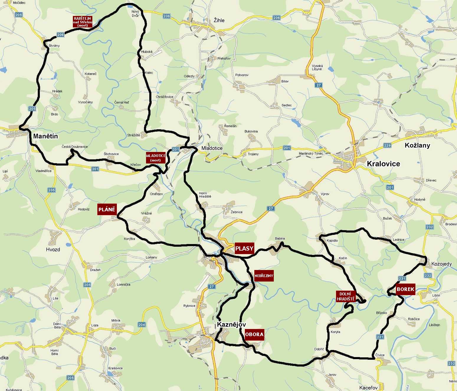 PLASY most – Nebřežiny – Obora – Dobříč – Dolní Hradiště – Kočín – Kopidlo – Lednice – Kozojedy –Pipluv mlýn – Kaceřov – Dobříč – Koryta – Dolní Hradiště – Kočín – Babina – Nebřeziny – Obora – Kaznějov – podél potoka do Plas – přes most do Horního Hradiště – Mladotice – žst. Mladotice – Štichovice – Česká Doubravice – Manětín – Stvolny - Rabštejn – Nový Dvůr – lesní cestou doprava do Hluboké – Hluboká – dvůr Kalec - Velká Černá Hať – Strážiště – Mladotice – žst. Mladotice (přes most) – Ondřejov – Pláně – Korýtka - PLASY